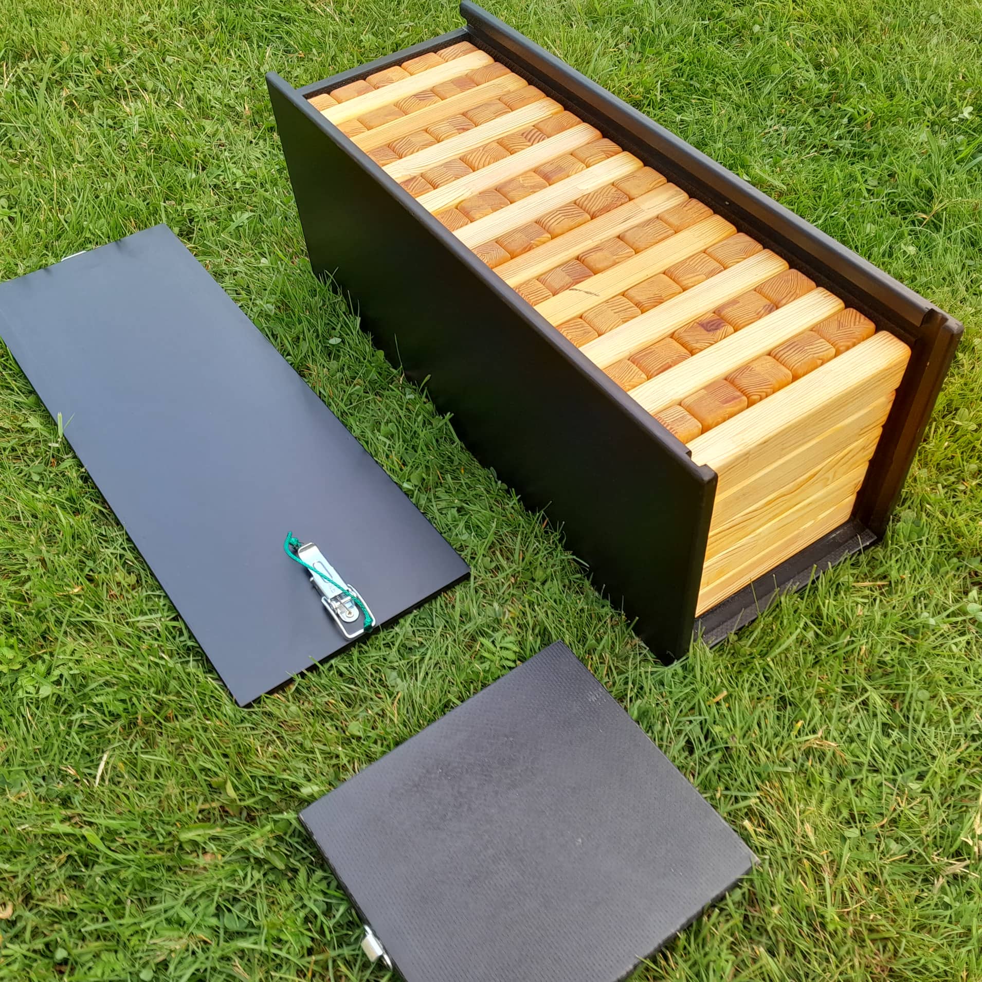 Kastes izmērs 54 x 20 x 20 cm. Torņa izmērs sākotnēji – 51 x 18 x 18 cm. Kastē 100 gab. klucīši 17.50 x 3.5 x 2.5 cm.